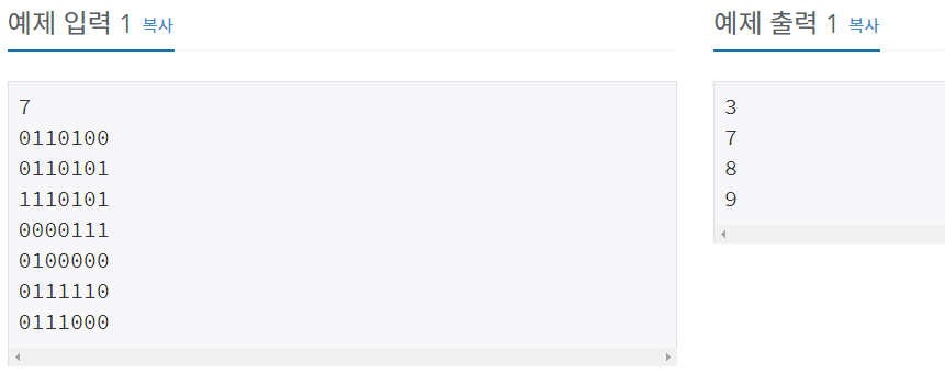 <그림 1>과 같이 정사각형 모양의 지도가 있다. 1은 집이 있는 곳을, 0은 집이 없는 곳을 나타낸다. 철수는 이 지도를 가지고 연결된 집들의 모임인 단지를 정의하고, 단지에 번호를 붙이려 한다. 여기서 연결되었다는 것은 어떤 집이 좌우, 혹은 아래위로 다른 집이 있는 경우를 말한다. 대각선상에 집이 있는 경우는 연결된 것이 아니다. <그림 2>는 <그림 1>을 단지별로 번호를 붙인 것이다. 지도를 입력하여 단지수를 출력하고, 각 단지에 속하는 집의 수를 오름차순으로 정렬하여 출력하는 프로그램을 작성하시오.