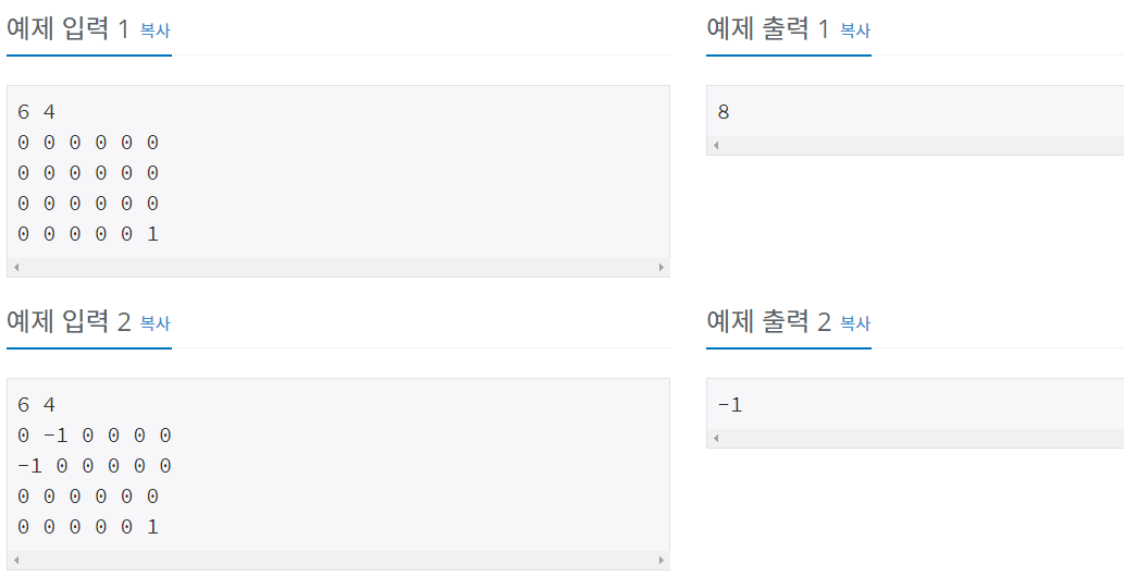 창고에 보관되는 토마토들 중에는 잘 익은 것도 있지만, 아직 익지 않은 토마토들도 있을 수 있다. 보관 후 하루가 지나면, 익은 토마토들의 인접한 곳에 있는 익지 않은 토마토들은 익은 토마토의 영향을 받아 익게 된다. 하나의 토마토의 인접한 곳은 왼쪽, 오른쪽, 앞, 뒤 네 방향에 있는 토마토를 의미한다. 대각선 방향에 있는 토마토들에게는 영향을 주지 못하며, 토마토가 혼자 저절로 익는 경우는 없다고 가정한다. 철수는 창고에 보관된 토마토들이 며칠이 지나면 다 익게 되는지, 그 최소 일수를 알고 싶어 한다.