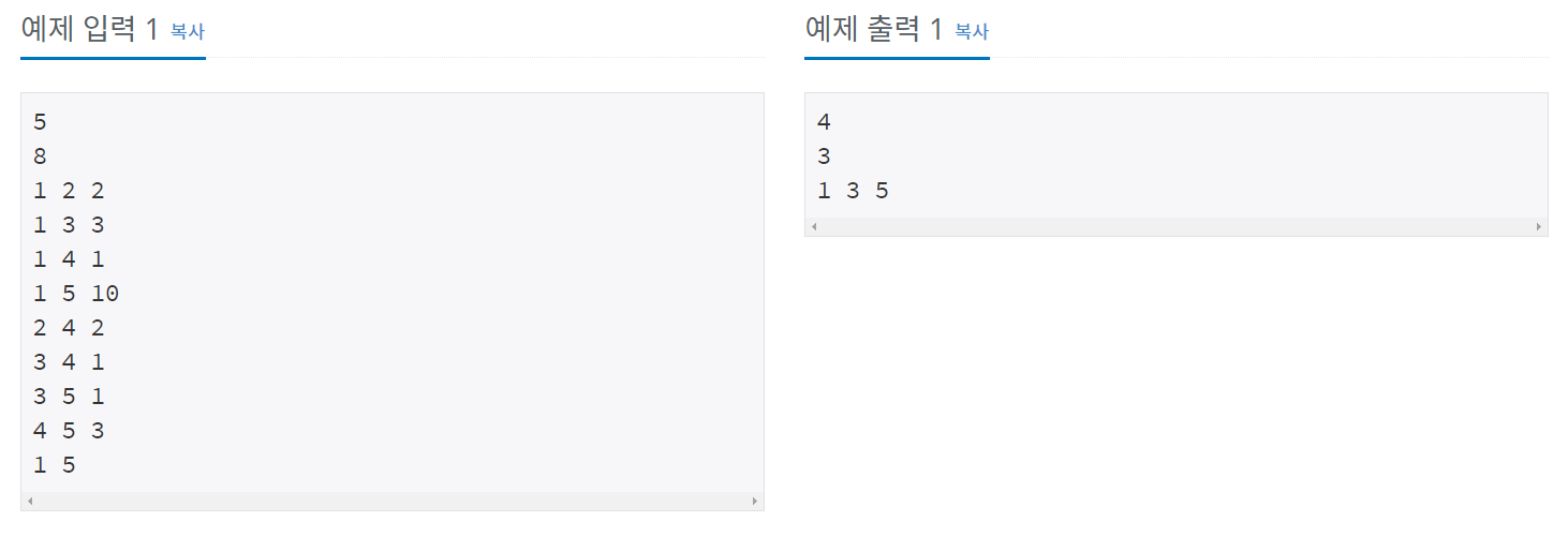 n(1≤n≤1,000)개의 도시가 있다. 그리고 한 도시에서 출발하여 다른 도시에 도착하는 m(1≤m≤100,000)개의 버스가 있다. 우리는 A번째 도시에서 B번째 도시까지 가는데 드는 버스 비용을 최소화 시키려고 한다. 그러면 A번째 도시에서 B번째 도시 까지 가는데 드는 최소비용과 경로를 출력하여라. 항상 시작점에서 도착점으로의 경로가 존재한다.
